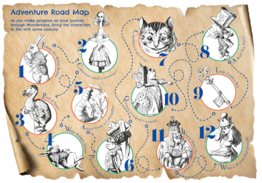 Explore Wonderland with a cheerful road map as your guide, celebrating your progress and leading you to magical destinations!